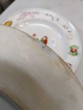 SIX VARIOUS 19TH CENTURY STAFFORDSHIRE POTTERY NURSERY PLATES, moulded borders, colour printed and painted with various subjects, and including one named to 'Emma Arle Mowbray', circular and octagonal, some with impressed marks, 14-19cm diam. (6)Comment: largest two slightly speckled/restored. Top left rim chip, top right stained and restored rim (as per image).