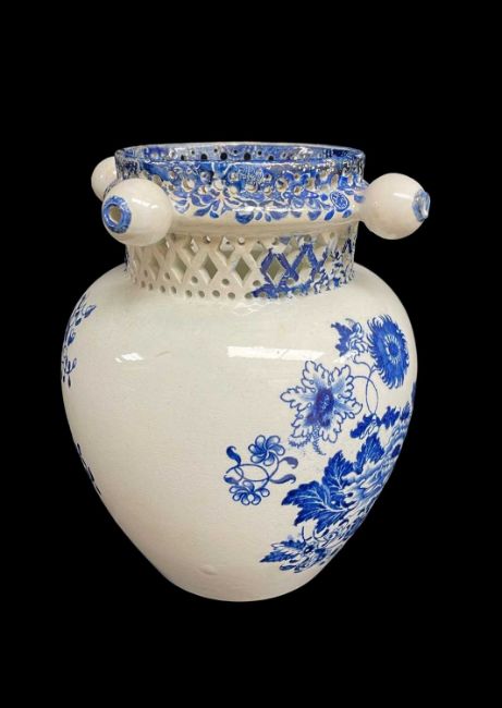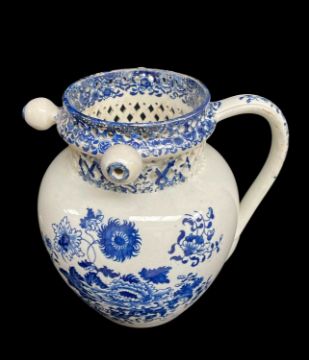 SWANSEA CAMBRIAN PUZZLE JUG circa 1810, ovoid shape and loop handle, with cylindrical neck pierced with diamonds and circles and applied with three nozzles, printed in underglaze blue with chrysanthemums and other flowers, the handle with a trailing foliate stem, 18cms high