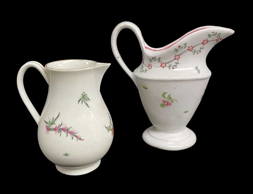 TWO 18TH CENTURY ENGLISH PORCELAIN CREAM JUGS, including Worcester sparrow beak jug with grooved strap handle, decorated with an insect, sprigs and a spray of summer flowers, gilt rim, c. 1760, 8.8cm high; and a New Hall N191 pattern silver shaped jug, decorated with undulating floral garland to the neck above flowers sprays and spreading foot, c. 1795, label for A. de Saye Hutton New Hall Collection, 11.6cm h (2)Comments: Worcester with hairline crack at spout.Provenance: private collection Neath Port Talbot, consigned via our Carmarthen Office