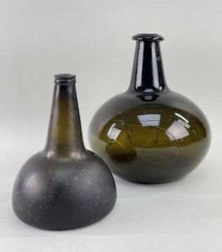 TWO GLASS ONION BOTTLES, comprising a large compressed spherical bottle in olive green glass, 25cm h, and a globe and shaft bottle, smaller, 18th Century (2)Comments: both with body cracks