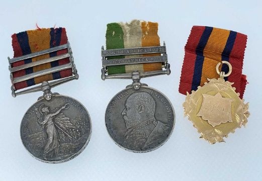 BOER WAR QSA / KSA PAIR TO PTE. F. MASLPASS. S. WALES BORDERERS, each named, the QSA with clasps: Johannesburg, Orange Free State & Cape Colony, the KSA with both dated clasps, 2 spare ribbons, together with a related 9ct gold watch fob, presented to Fred Malpas (sic), engraved, "Nantyglo & Blaina, Dec 17 1902, ... on his return from the South African War", 13.4g (3)