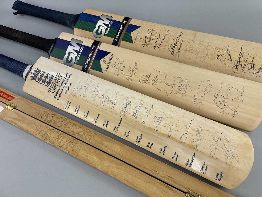 SIGNED CRICKET BATS & STUMP, comprising England & West Indies teams on Gray-Nicholls split stump c.early 1980s; 1999 Australia World Cup team on G&B souvenir bat; 2009 England NatWest Series vs Australia on souvenir bat; 2002 Gloucester team on G&M souvenir bat (4)