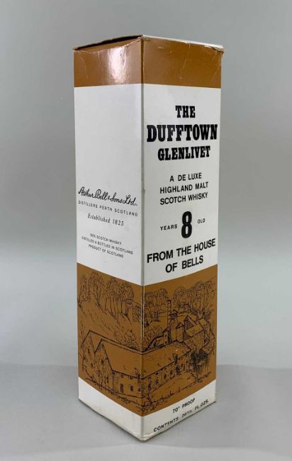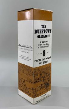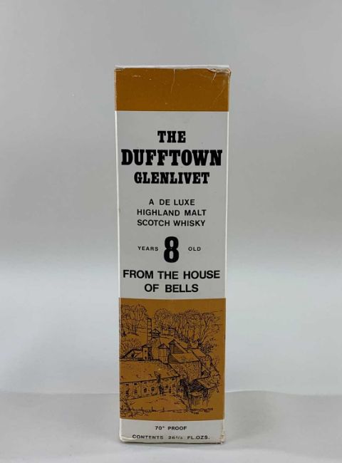 ONE BOTTLE OF DUFFTOWN GLENLIVET 8YO MALT WHISKY 26 & 2/3fl.ozs 70° proof (indicating pre-1980's bottling) Comments: fill-level excellent, very good label and capsule, presentation box creased and dog-eared