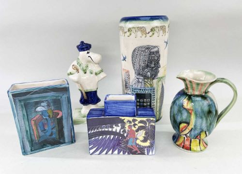 FIVE BONCHURCH POTTERY ITEMS, comprising cylinder vase 25cm h, jug 15cm h, two slab vases and a figure (5)