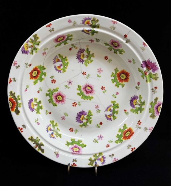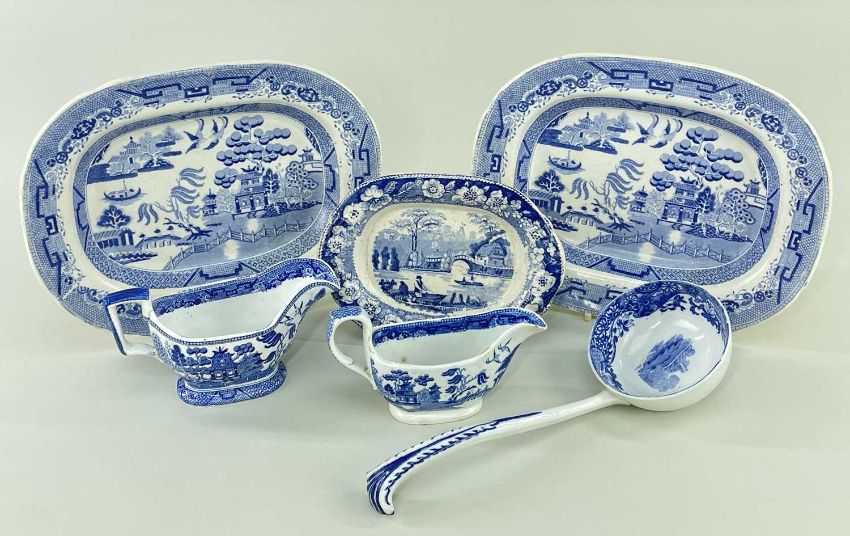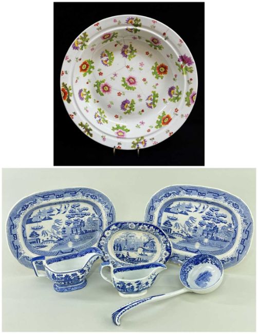 SWANSEA BASIN FROM THE 'MARINO BALLROOM' SERVICE circa 1815, naively painted in bright enamels with scattered flowers and boughs, 31cms diam together with BLUE & WHITE TRANSFERWARE POTTERY INCLUDING SWANSEA ,19th Century, pair of Dillwyn Swansea 'Improved Willow' platters, ladle, two jugs etc (6)