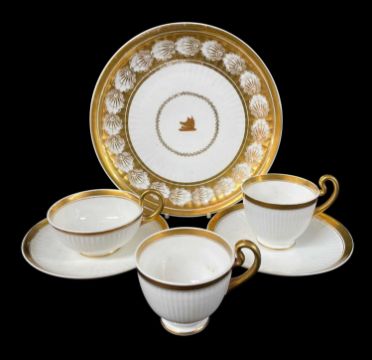 SWANSEA PORCELAIN PARIS FLUTE ITEMS circa 1815-1820, all with gilding and comprising one trio, similar pattern cup and saucer and a non-matching stand with centred boar’s head crest, 23cms diam