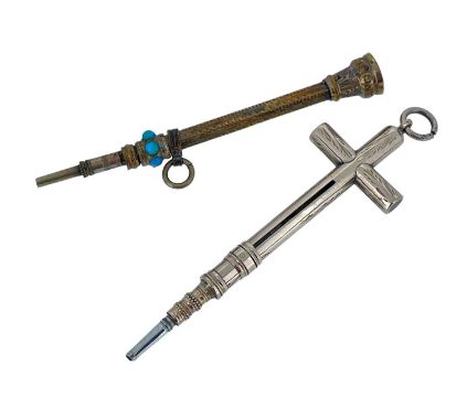 TWO MINIATURE PROPELLING PENCILS, including unmarked yellow metal (presumed 9ct) crucifix pencil, probably by S. Mordan, 4cm, and a gold plated pencil with turquoise set collar slide and hardstone terminal, 4.3cm long (2)