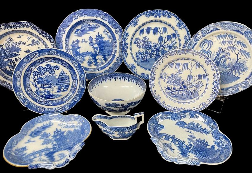 AN INTERESTING GROUP OF TEN WELSH TRANSFER POTTERY early 19th Century, comprising two ‘Elephant Rock’ plates, ‘The Good Catch’, near pair of scroll handled hors d’oeuvres dishes, ‘Boys with Whips’ plate, ‘Lady with Parasol’ plate, ‘Longbridge’ patterned jug and rural scene footed bowl