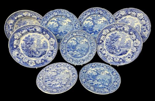 NINE SWANSEA BLUE & WHITE TRANSFER EARTHENWARE ITEMS five ‘Ladies of Llangollen’ plates, impressed marks to each, and four items in ‘Cows Crossing Stream’
