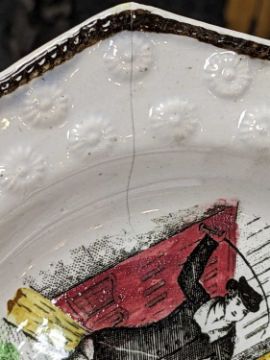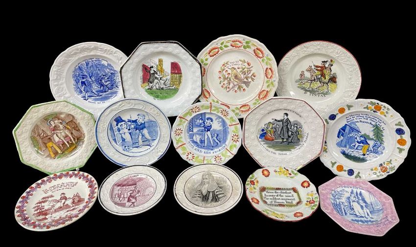 GROUP OF FOURTEEN TRANSFER NURSERY PLATES WITH TITLES / DITTIES, early 19th Century, some possibly Welsh, comprising ‘Dr Syntax’, ‘Tom Tit in a Cherry Tree’, ‘Yet steady are thy motions all, I never knew thee slip or fall, No gentle to the pat or call, Art thou my pony’, ‘Tom and his Pigeons’, ‘Baker’, ‘My Grandfather’s Hat & Wig’, ‘Father Matthew Administering the Total Abstinence Pledge’, ‘The Cruel Boy’, ‘Dogility’ etc
