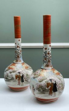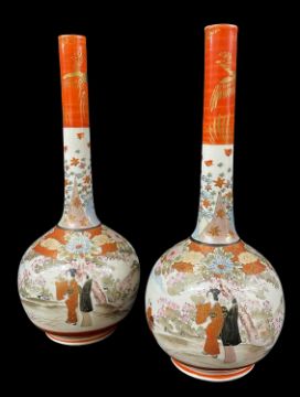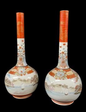 PAIR JAPANESE KUTANI PORCELAIN BOTTLE VASES, Late Meiji Period, decorated with figures amongst flowering kiku in a river landscape, 3-character marks, 26cm h (2)Provenance: private collection Neath Port Talbot, consigned via our Carmarthen Office