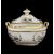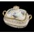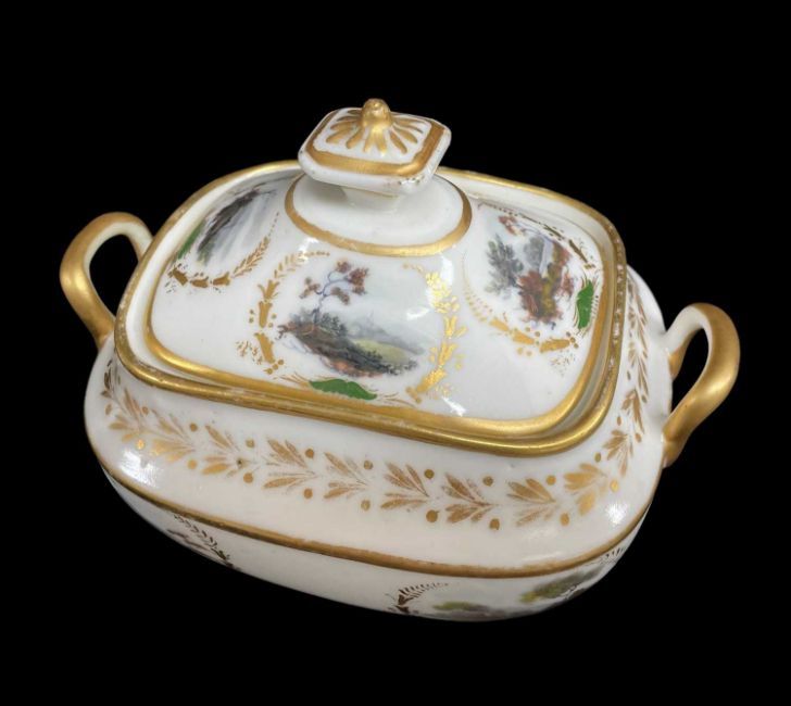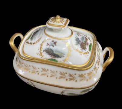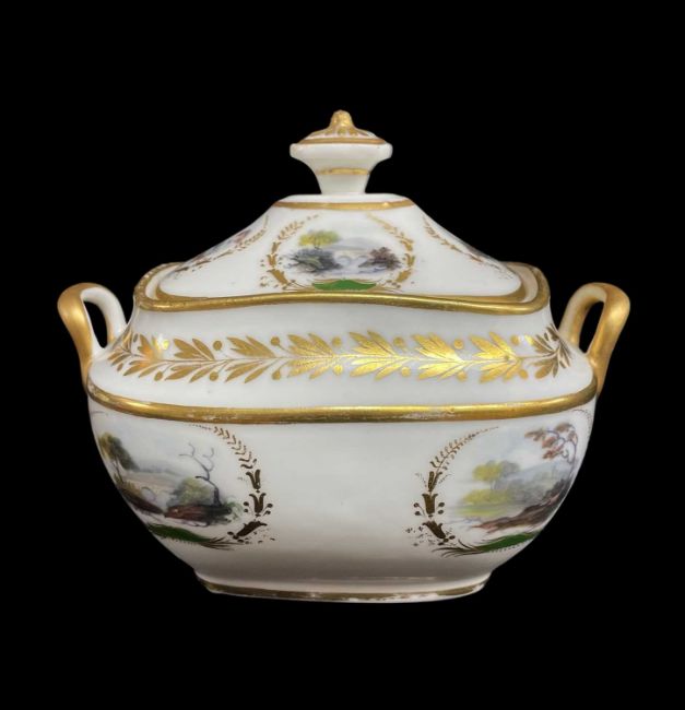 RARE SWANSEA GLASSY PASTE PORCELAIN SUCRIER & COVER, circa 1815-1817, of rectangular form with twin-handles and silver shaped finial picked out in gold, painted by William Billingsley with landscape vignettes within garlands of gilded foliage and green enamel bases, Swansea script mark to base, 14cms handle to handle