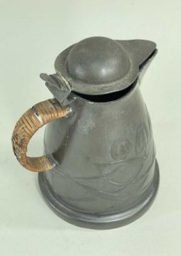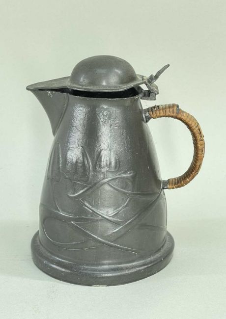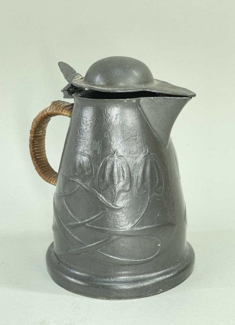 LIBERTY & CO 'TUDRIC' PEWTER WATER JUG, DESIGNED BY ARCHIBALD KNOX, with interlaced honesty leaves, original rattan covered handle, with Liberty and model number '0958' stamped to base