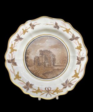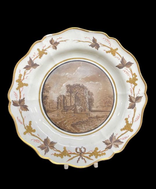 RARE SWANSEA CREAMWARE DISH DECORATED BY WILLIAM WESTON YOUNG of lobed form, painted in sepia monochrome with a titled view ‘Furness Abbey, Lancashire’ by Weston Young, the border with tied garland of fruiting vine in brown, gold and iron red, 19cms diam