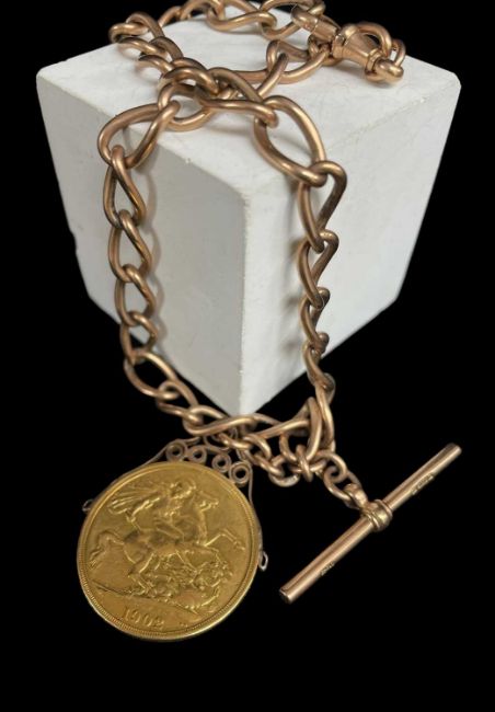 9CT GOLD ALBERT WATCH CHAIN, curb link with T-bar and scroll mounted Edward VII double sovereign dated 1902, 48.5gms grossProvenance: private collection Cardiff, consigned via our Cardiff Office