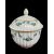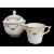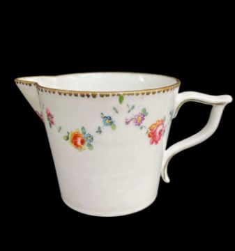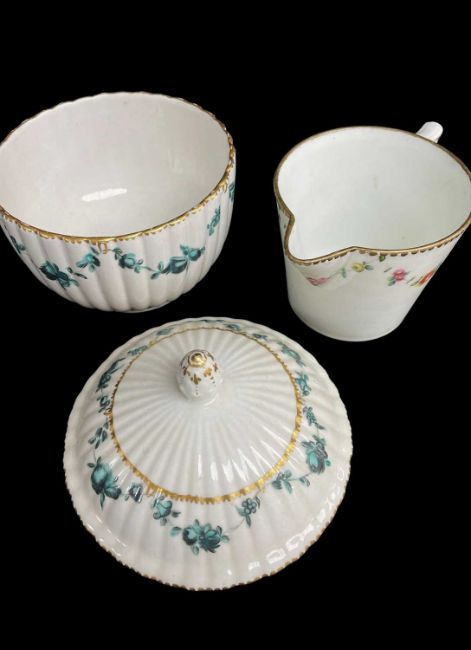 CHELSEA-DERBY JUG & FLUTED SUCRIER & COVER, c. 1775, jug of tapering form with polychrome enamelled floral garlands, dentil rim, 7.3cm h; sucrier enamelled in green camaieu with floral garlands, line and dentil gilt borders, 13cm h., both with gilt D and anchor mark (3)Comments: jug restored, sucrier cracked.