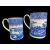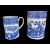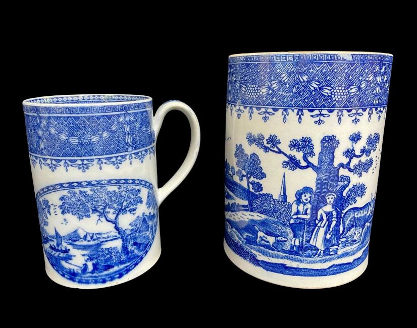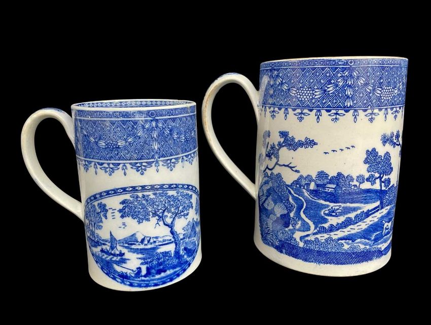 TWO RARE SWANSEA BLUE & WHITE TRANSFER TANKARDS comprising large ‘Rural Lovers’ with chocolate rim, circa 1800, 15cms high, and smaller with mountain lake scene, circa 1796, 12.5cms high