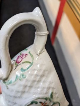 DERBY PORCELAIN OVAL SAUCE BOAT, c. 1765, moulded with an overlapping leaves and reserved with panels of summer flowers within green scrolled borders, further floral springs to interior and spreading foot, brown enamel rim, 21cm longProvenance: private collection Neath Port Talbot, consigned via our Carmarthen OfficeComments: firing fault to handle, green enamel faded, otherwise very good.