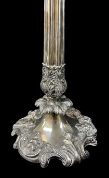 LARGE ELECTROPLATED FIVE-LIGHT CANDELABRUM, with 4 scrolled acanthus leaf arms supporting nozzles chased with leaves and fruiting vines on a shaped knopped stem and base engraved with a crest, 62 h x 46cms wProvenance: contents of Machen House, Lower Machen in the County Borough of Caerphilly.