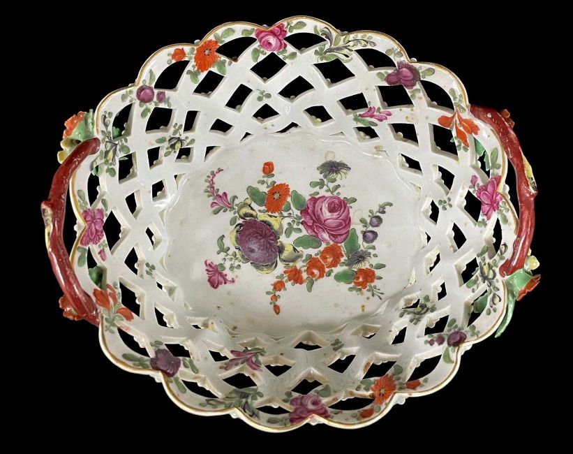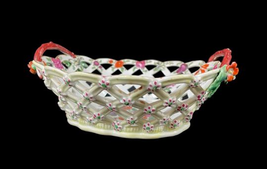 WORCESTER PORCELAIN OVAL BASKET, c. 1768-1772, yellow ground exterior applied with pink and green florets, twin crabstock handles with leafy flower spray terminals, the centre painted with flower sprays, the insides with smaller sprigs, gilt rim, 18cm wide