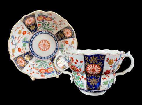 WORCESTER KAKIEMON PORCELAIN CHOCOLATE CUP & SAUCER, c. 1770-80, decorated in the 'Rich Queens' pattern in underglaze blue and coloured enamels, gilt highlights and rims, bases with square seal marks (2)Provenance: private collection Neath Port Talbot, consigned via our Carmarthen OfficeComments: excellent overall.
