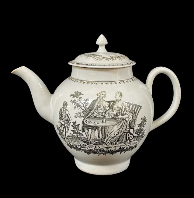 RICHARD CHAFFERS (LIVERPOOOL) PORCELAIN TEAPOT & COVER, c. 1765, printed in black with the 'Tea Drinkers', a couple seated at a table in a garden setting and being waited on by a young Turk, the reverse of the teabowl with a shepherd tending his flock, 16cms high (2)Provenance: private collection Neath Port Talbot, consigned via our Carmarthen Office, with Sotheby's (Margam Park) 23/3/2001Comments: knop grazed, cover possiby associated.