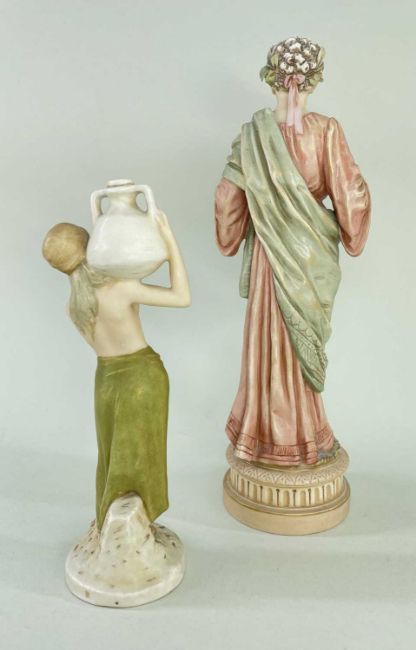 ROYAL DUX FIGURES, classical / Roman figure with musical instrument, model no. 224, 28cms high, together with young female carrying a water jug, model no. 1443, 20cms high, both with maker's pink triangle mark to base (2)