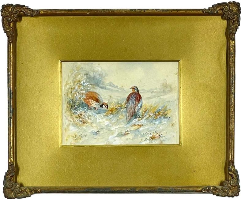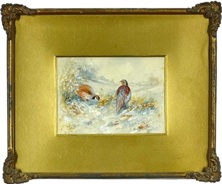 JAMES STINTON (British, 1870-1961) watercolour studies - cock and hen pheasant, 13.5cms h (oval), pair partridge, 9.5 x 13cms, both signed Jas Stinton; and another of a partridge, bearing a signature, 8.5 x 6cms (3)
