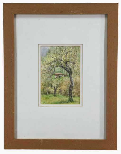 JANE CARPANINI watercolour - view through trees towards a red tiled roof and whitewashed villa, entitled verso on Bankside Gallery label 'Vignacci', signed, 18 x 12cms