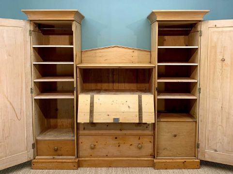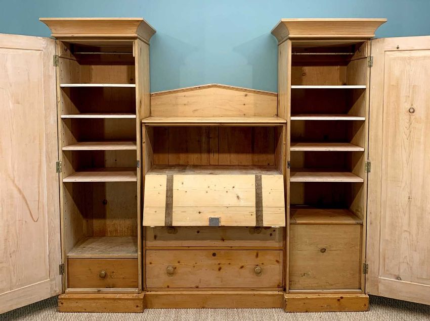 LATE VICTORIAN PINE COMPACTIUM, pair wardrobes flanking 4-drawer chest, 228 W x 61 D x 203 H cms