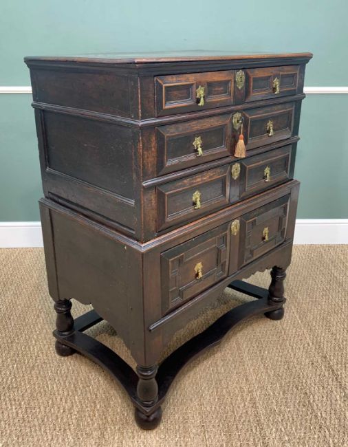 17TH CENTURY OAK GEOMETRIC FRONTED TWO PART CHEST ON STAND, fitted three graduated long drawers on a later base with single long drawer, raised on baluster legs joined by wavy bar front stretcher, bun feet, 91w x 58d x 122h cmsComments: base later