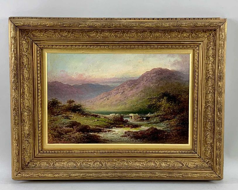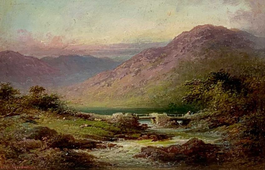 GEORGE GOODMAN (fl.1880) oil on board - figure on bridge at sunset, entitled verso 'The Old Bridge, Capel Curig, North Wales' , signed, 20 x 32cms