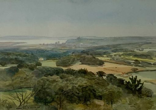 ARTHUR MILES RI (British, 1905-1987) watercolour - lane through woodland, entitled verso 'Lane to the Garth Mountain', signed and dated '74, 27 x 37cms, watercolour - view across Cardiff towards the Bristol Channel, entitled verso 'View From Little Garth, Pentyrch', signed and dated '78, 26 x 36cms and a coloured etching - view across farmland, entitled 'Llantrithyd', dated '74, 27 x 37cms (3)
