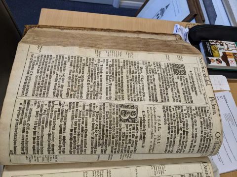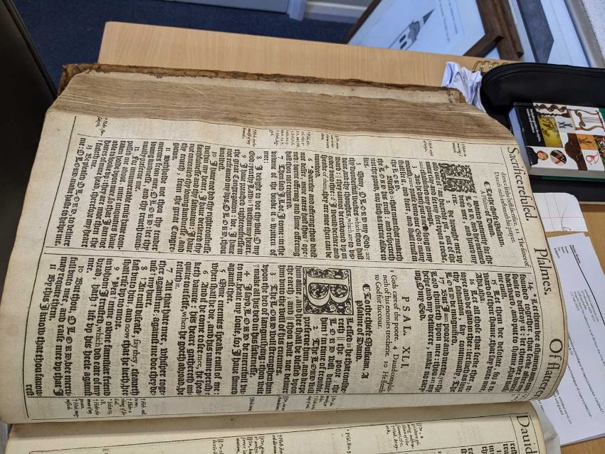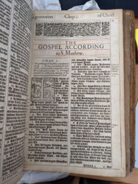 BIBLE, IN ENGLISH, KING JAMES VERSION, c. 1617 (Herbert 353), unoriginal title page, but containing The Table and Kalender, Lessons, Table for the order of the Pslams, Names and order of all the Bookes, end of the old Testament bearing spurious date 1574 (with red ink inscribed 'C. 1576 B.' below engraving), original red ruling though.comments: lacks New Testament title-page, maps, genealogies, various other end papers and pages, title page cut and pasted to end paper (possibly not original), both boards loose, spine degraded, pages creased, soiled, repaired, torn etc. inspection advised, contents incomplete.