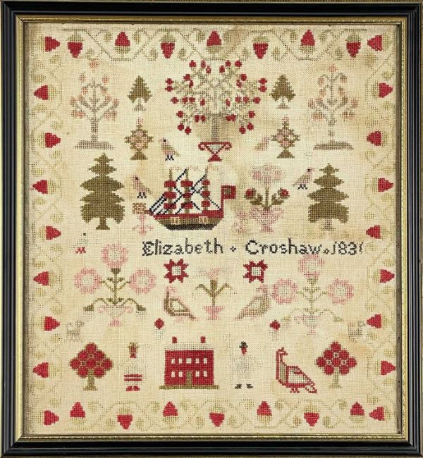 TWO 19TH CENTURY NEEDLEWORK SAMPLERS, comprising one by Elizabeth Crowshaw dated 1831, featuring a three masted tall ship, 33.5 x 30cms, another similar but smaller, 21 x 29.5cms (2)