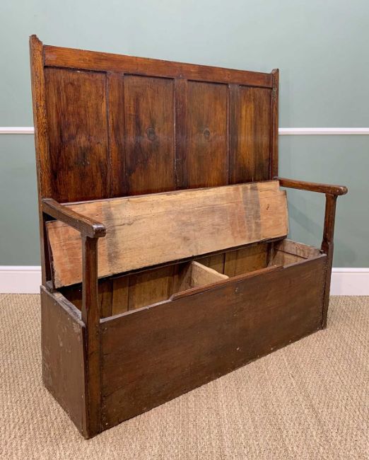 EARLY 19TH CENTURY OAK BOX SETTLE, with four panelled back and hinged seat, 132w x 47d x 130cms h
