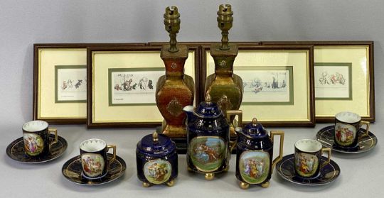 A VIENNA TYPE CHINA CHILD'S TEA SERVICE - blue glaze with gilded highlights and having transfer decorated panels, 11 pieces, after Boris O'Klein set of five humorous colour prints - dogs, 7 x 14cms and a pair of decorative table lamps with floral fabric shades, 50cms H overall