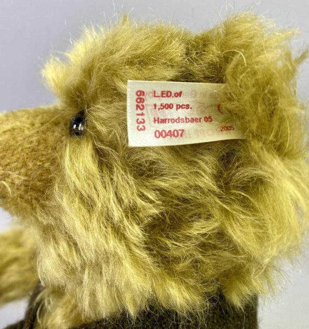STEIFF HARRODS TEDDY BEAR - limited edition (407/1500) 'Howard' a musical bear, having a brass blonde mohair covered body, wearing a tweed waistcoat with musical winding mechanism to the back, 30cms tall including box and certificate