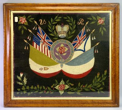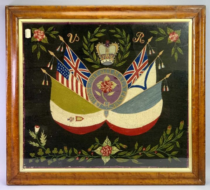 VICTORIAN WOOLWORK TAPESTRY PICTURE - Crowned Crest with flags of Great Britain and America and others, within a border of roses and other flowers, in maple frame, 65.5 x 72.5cms with a Belgian machine woven tapestry picture - soldiers with dog, 47 x 88cms and a more recent woolwork tapestry picture - Coronation procession, 28.5 x 44.5cms