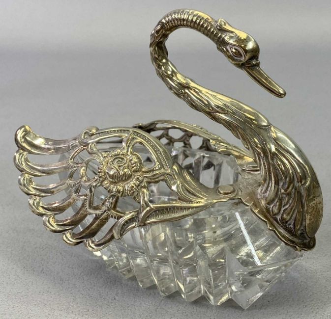 VINTAGE & MODERN HALLMARKED SILVER WARE - 7 items to include a plastic lined sugar caster, Birmingham 1937, Maker Joseph Gloster Ltd, 16cms H, cut glass and silver mounted swan trinket dish stamped '925' with import marks, 10cms H, 11.5cms L and five hallmarked silver napkin rings, three for Chester and two with Birmingham hallmarks, various dates and makers