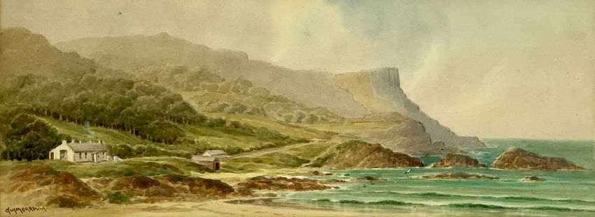 G W MORRISON watercolours (3) - 'Doo Lough Mayo', signed lower right and titled lower left, 25 x 36cms, 'Lough Finn Donegal', signed lower right and titled lower left, 14.5 x 28.5cms and an extensive coastalscape with cottages to side, signed lower left, 22 x 58.5cms