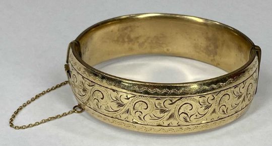 EARLY 20TH CENTURY & LATER JEWELLERY - 3 items to include a Birmingham 1909 bicolour fob on silver necklace chain, 1977 London bullion type ingot pendant on a silver belcher link necklace and a 9ct gold metal core bangle with chased decoration to one half, 6.75cms diameter