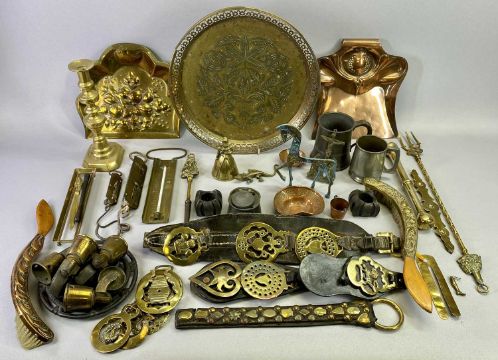 BRASS, COPPER & METALWARE - a mixed quantity including a Beldray Art Nouveau copper crumb scoop and brush with stylised embossed decoration, stamped 'Beldray Rd. 318304', a brass crumb scoop and brush embossed with fruit, various horse brasses and Martingales, two Salters spring balance, two pewter tankards, ETC