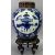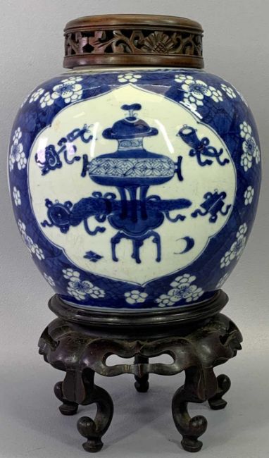 CHINESE BLUE & WHITE KANGXI STYLE GINGER JAR - decorated with blossom and with three panels containing jardinieres and vessels with pierced hardwood cover and stand, 33cms H
