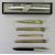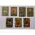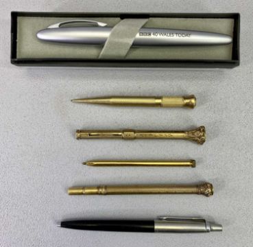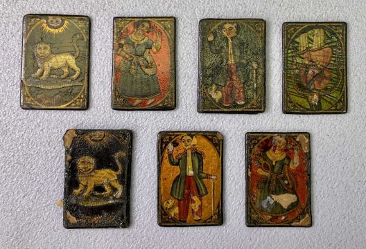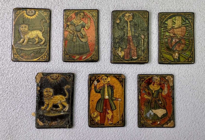 VINTAGE CASH TIN with mixed collectables content to include seven Qajar Period papier mache playing cards, 3.75 x 2.75cms, two depicting a man with his dog, two depicting a standing lion, two showing a lady gathering flowers and one of a seated nobleman, all hand painted illuminations against a black lacquer ground, small scarab beetle bead, a worn piece of possibly volcanic rock, three African and European bank notes, two screw top brass containers holding brass phials, 8cm heights, small quantity of current 20p coins and five pens/pencils to include a gold filled propelling pencil stamped 'Mordan Everpoint', a dip pen in gold plated finish with amethyst glass mounted top stamped 'S Mordan & Co Makers', ETC