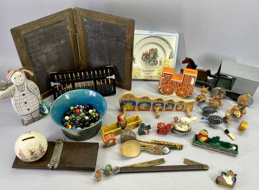 VICTORIAN SCHOOL SLATE in folding pine case, 33.5 x 23cms closed, a vintage abacus, 12 x 25cms, vintage oak tie press, Royal Doulton Bunnykins moneybox, ETC
