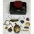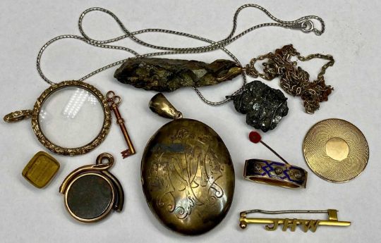 ANTIQUE & LATER PRESUMED GOLD/YELLOW METAL and other jewellery ETC contained in a vintage papier mache box, lot includes an unmarked yellow metal scarf clip, having blue enamel decoration to the front in crossover panels, each panel set with a small individual diamond, with sprung hinge opening action, 28mm across, 6.5grms, unmarked swivel fob set with circular hardstone agates, 28mm across, 8.1grms, unmarked circular pendant portrait frame, the outer rim and jump ring having floral decoration in relief, the now loose back with engine turned decoration, unmarked bar brooch mounted with the initials 'J H W', unmarked oval locket, engraved initials to the front, 6.75cms overall L, two crystal formation pendants, one possibly being sapphire in the raw, a small gilt metal key and a small glass intaglio type item engraved with two bands of music notes and the words 'Ah Deign a kind reply'
