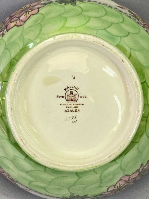 MALING AZALEA BOWL, 21cms diameter, a Regal ware 'Pescadina' circular bowl, 16cms diameter, a Losolware panelled bottle vase, 23cms H, Crown Devon Rouge Royale side handle vase decorated with gilt leaves and enamelled berries, 23cms H, a Limoges circular shallow bowl, Blush Ivory with leaves and flowers, 22.5cms diameter, a pair of Aynsley 'Pembroke' bottle vases, 18cms H, ETC