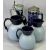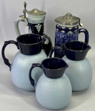 LOVATTS LEADLESS GLAZE a set of three graduated jugs, light blue bodies, dark blue necks and handles, 18cms H the tallest, 19th century blue and white transfer decorated tableware including oval serving plates, warmer plate, shaped oval dish on pedestal stand, a German stoneware pewter lidded jug, 29cms H, ETC