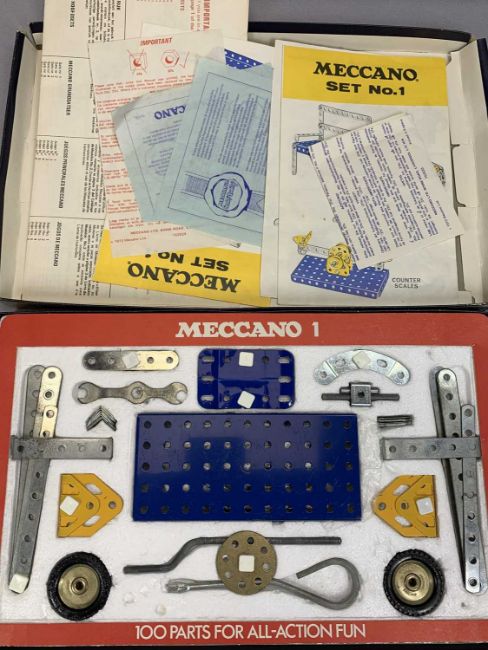 MECCANO BOXED SETS (2), Set No 4 and Set No 1, both with instructions, Tonka toys including a Mighty Tonka dump truck, 47cms L and three small cars, a small Triang fire engine, a Denys Fisher stickle bricks building set, standard set boxed and a Playplax rings building set, boxed, with a box of children's plastic toys including skittles, train set and other items